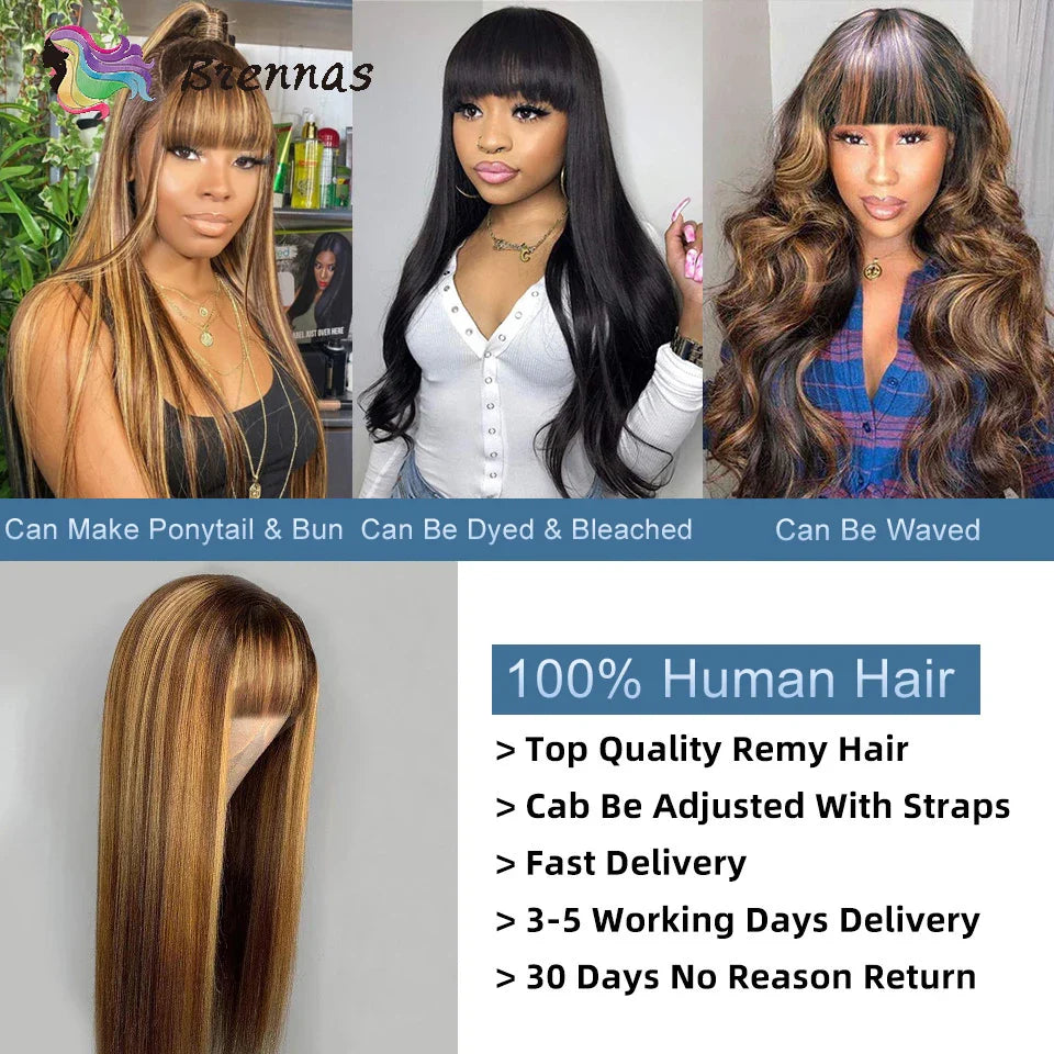 Ombre Human Hair Wigs Highlight Straight Wig With Bangs Glueless Machine Made Wigs 100% Peruvian Human Remy Hair For Black Women