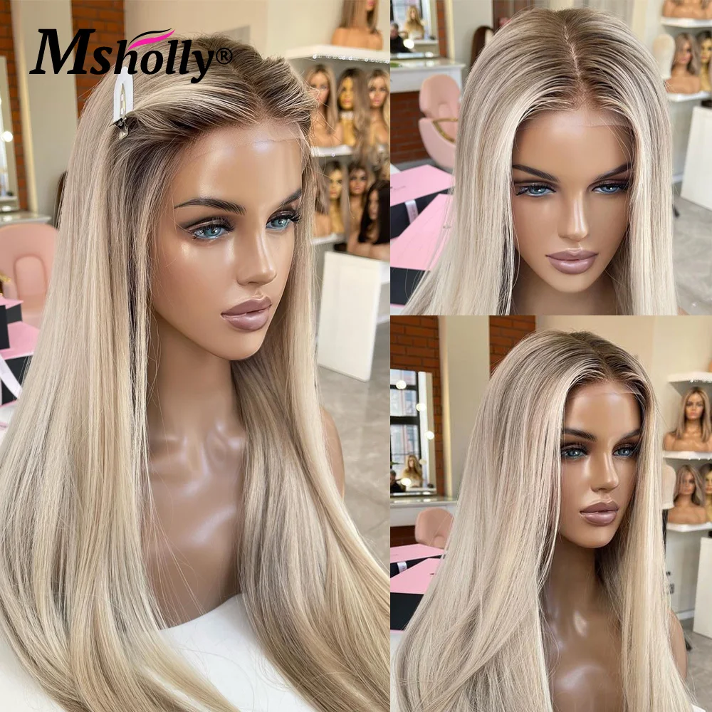 Ash Blonde Lace Frontal Wig With Dark Roots