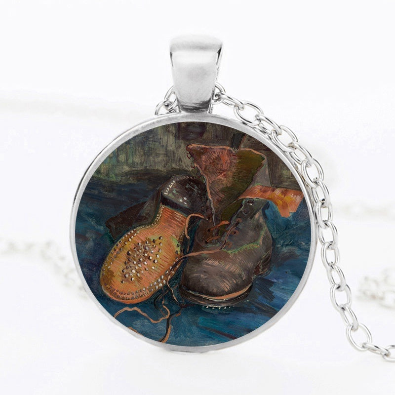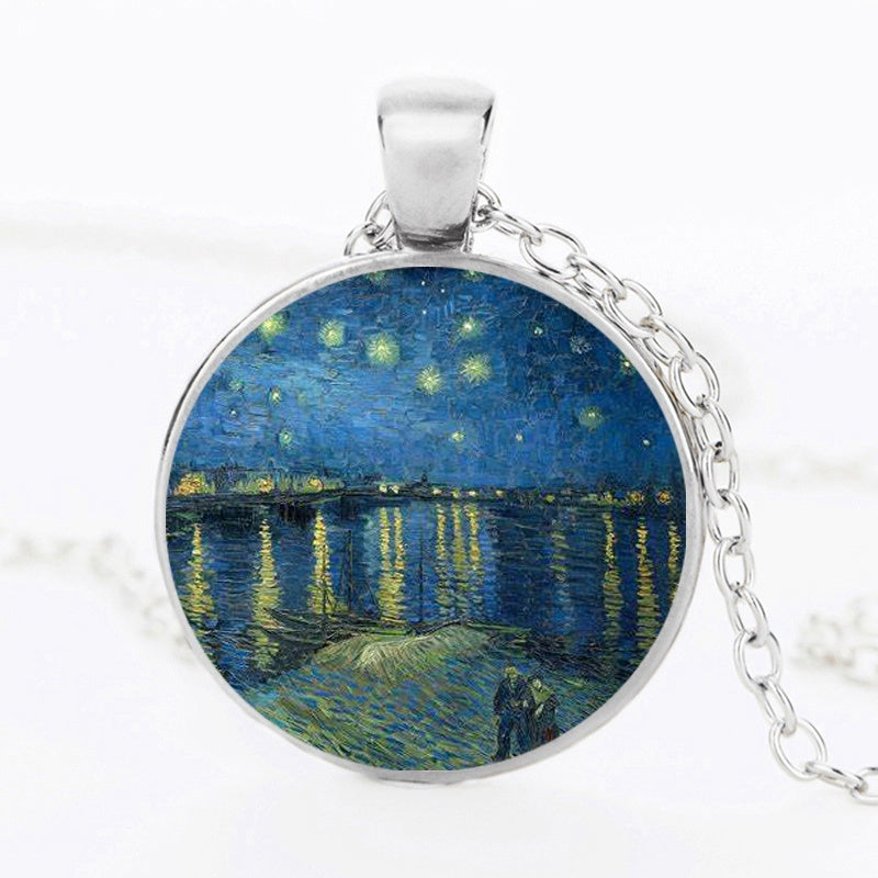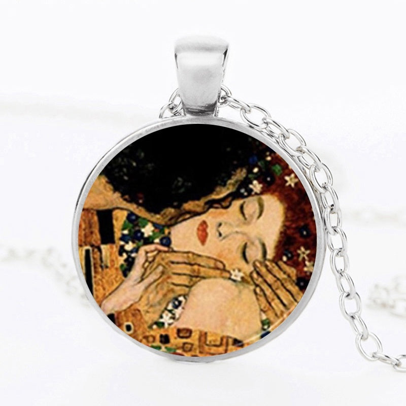 The Kiss Starry Night Sunflower Glass Necklace Van Gogh Klimt Painting Round Pendant Chain Necklaces For Women Girls